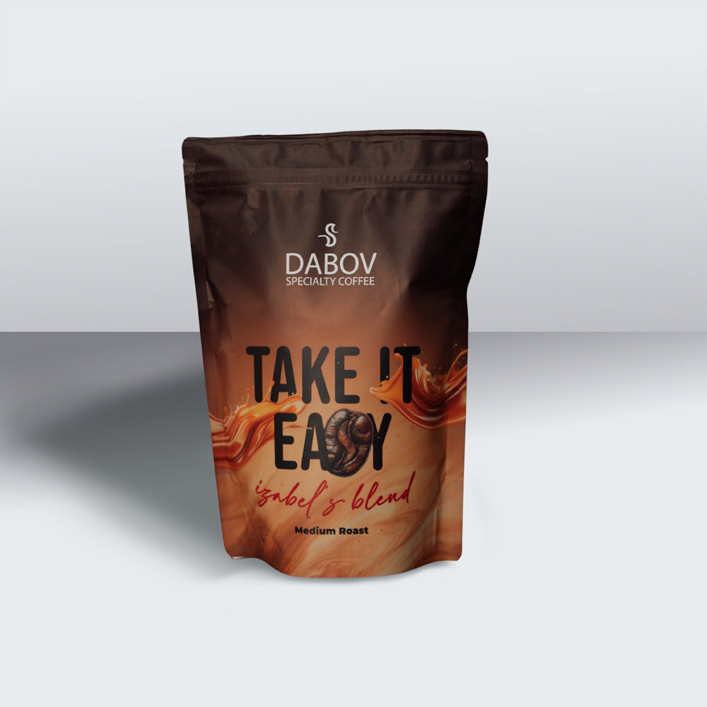 Izabel's Blend TAKE IT EASY - спешълти кафе - е ароматен бленд 100% спешълти Арабика, създаден да носи спокойствие и наслада в ежедневието, качествен живот отвътре и отвън. С внимателно подбрани зърна и средно изпичане, той предлага мек и балансиран вкус, идеален за моменти на релаксация, като съчетава плътно тяло и вкусове на карамел и шоколад. Кафето е подходящо за различни методи на консумация (еспресо, френска преса, кафеварка), за които е препоръчително да бъде смляно до оптимална степен. Можете да смелите кафето както в домашни условия, ако разполагате с кафемелачка, така и в някоя от локациите на Dabov Specialty Coffee.