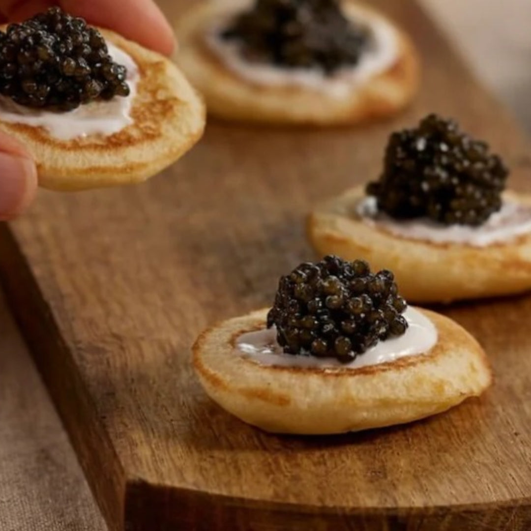 - Блини с елда с черен хайвер от есетра и крем фреш – малки, елегантни хапки с голям вкус, които внасят усещане за лукс и специален повод