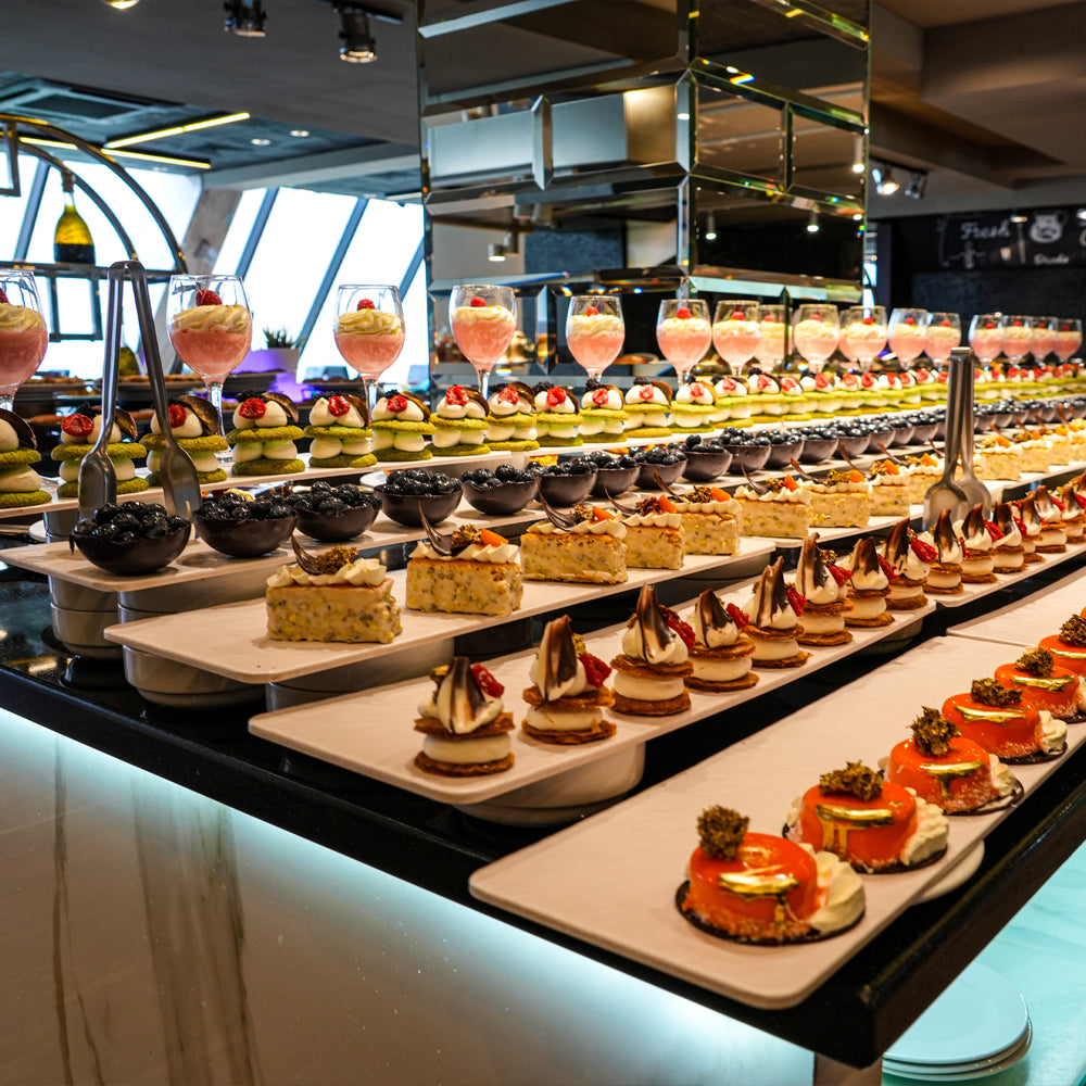 - 15:00-18:30 - Снак Лаундж бар– следобедни закуски, топли и студени закуски, сезонни плодове, сандвичи, пици, дребни сладки, соленки, сладък бюфет с домашно приготвени десерти, диетична секция
