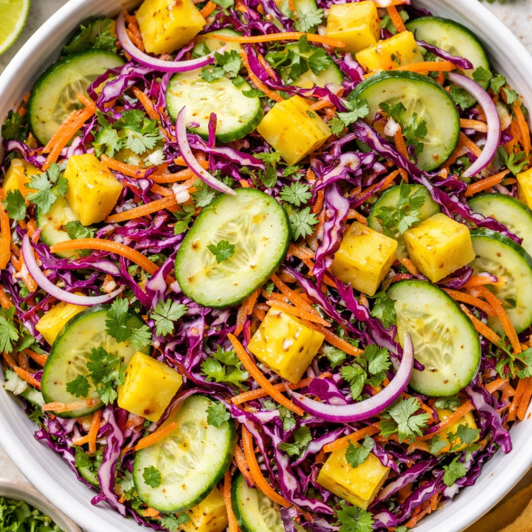 - Тропическа салата с краставици, манго и червено зеле – свежа, сочна и цветна – хрупкавостта на зеленчуците се комбинира с естествената сладост на мангото и лека киселинност, която събужда апетита и освежава всяка хапка