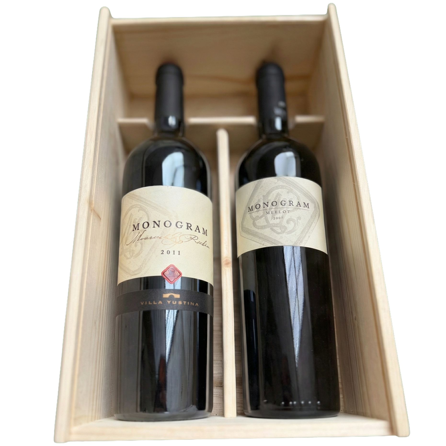 Енотечен пакет – Монограм Винтидж Вила Юстина - комплект от най-емблематичната серия на Вила Юстина - Монограм. Незабравимите реколти 2007 Мерло и 2011 Мавруд и Рубин са от вината, които с годините стават по-добри за консумация и в момента са в своя пик. Насладете се на дълбок наситен червен цвят, с леки гранатови отенъци, с комплексен аромат на зрели горски плодове, мармалад от сини сливи, съчетани с аромати на тютюн и подправки. Виното е с плътно и балансирано тяло, интензивни танини и пикантен финал.